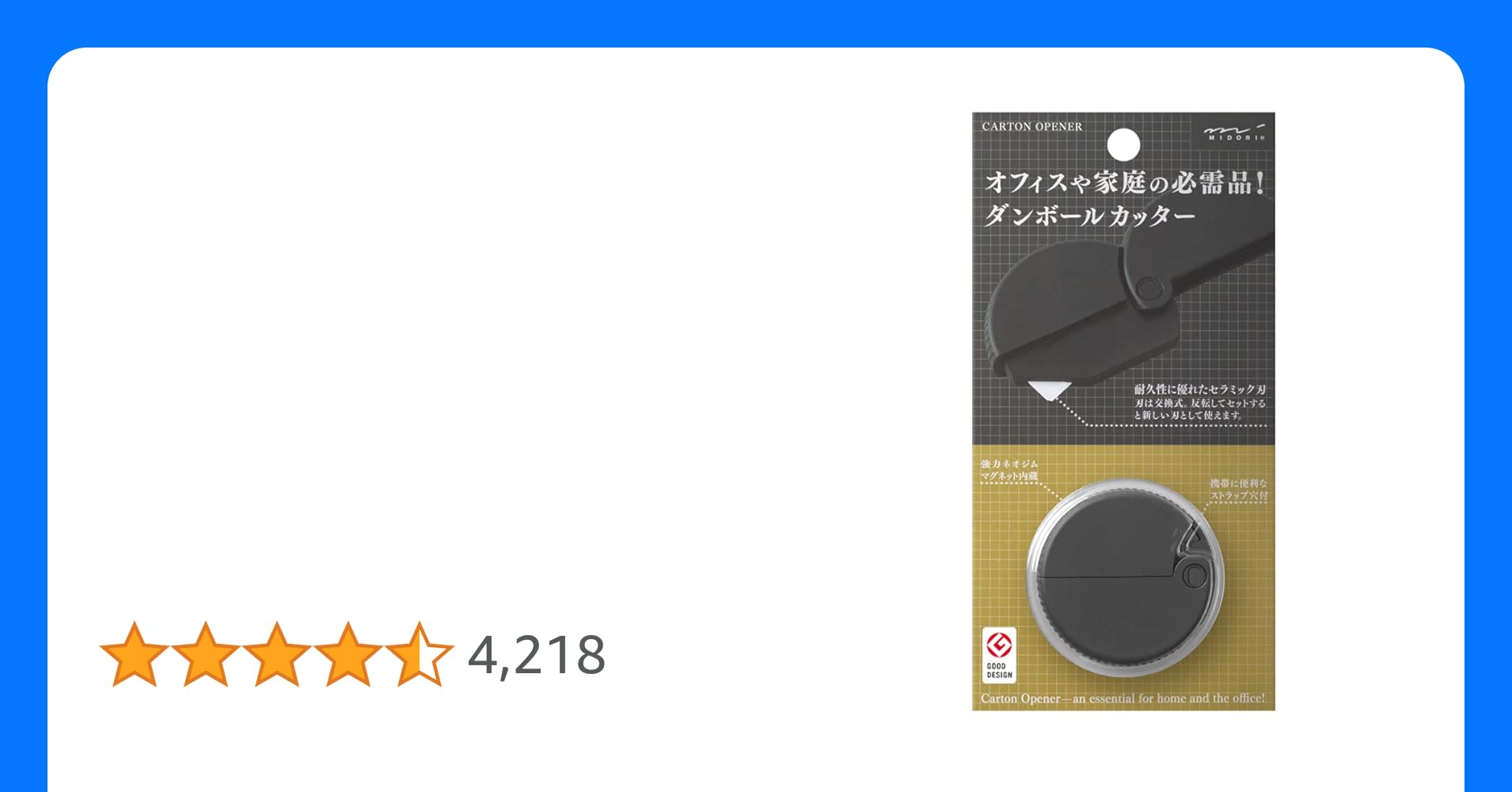 - 特殊な刃の角度: ダンボールの開梱に最適な角度に設計されており、力を入れずにスムーズに切れます。